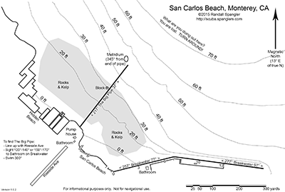 There is a large (30" diameter) pipe extending out from the old pump house next to the bathrooms on the right edge of the beach. It varies from all the way above the sand to almost totally buried in sand for about 20 yards just past the smaller pipes. There are some nice rock outcroppings to the north of the pipe midway out next to a tilted concrete mooring block; those are in 35 fsw and accessible to less experienced divers.